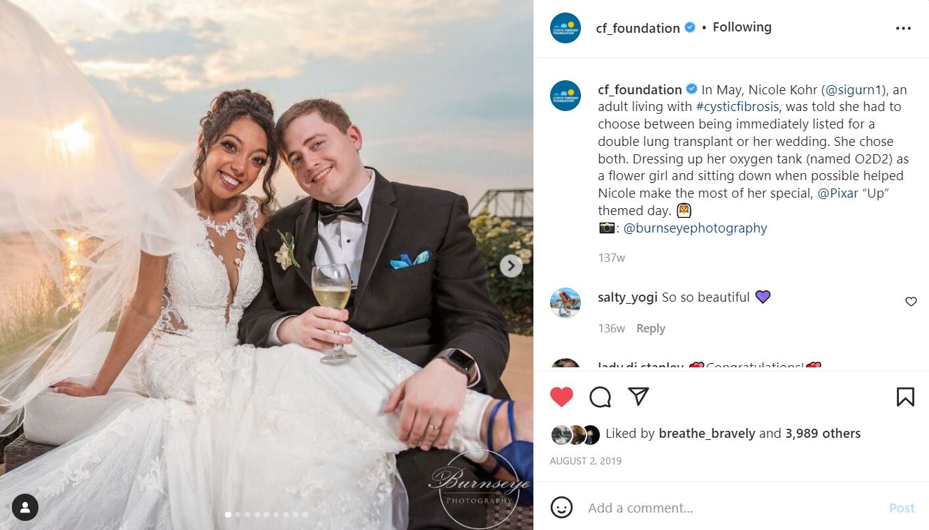 On June 14, 2019, thirteen days after her wedding, Nicole received her bilateral lung transplant. Despite several post-surgery complications, Nicole took her first steps just three days after her surgery. Patty documented all of this on social media @psigur. She was discharged to outpatient rehab on July 4, 2019, and graduated from PT on July 17, 2019.