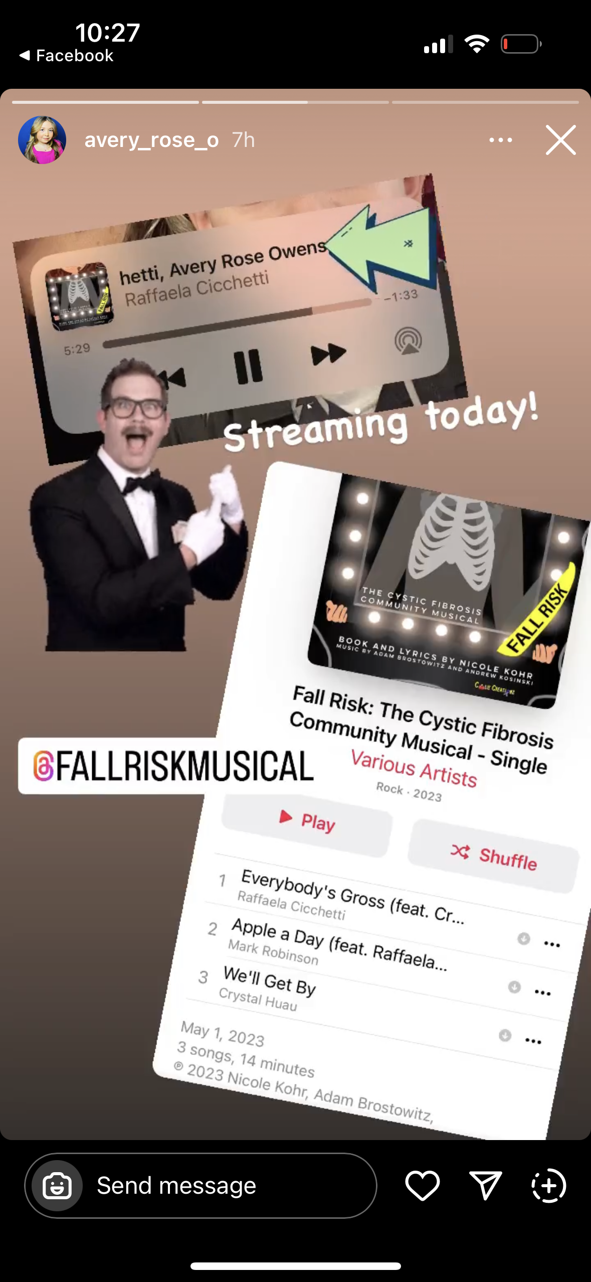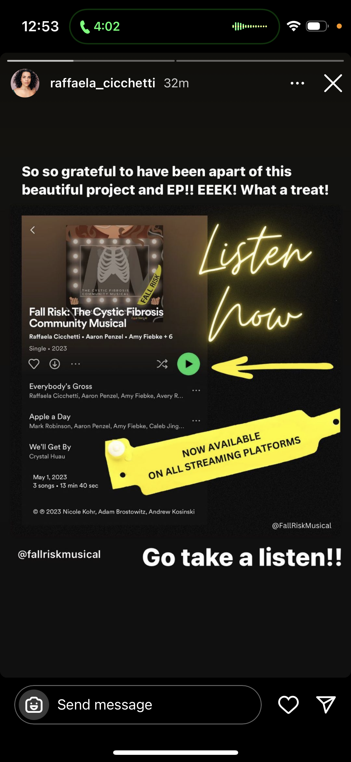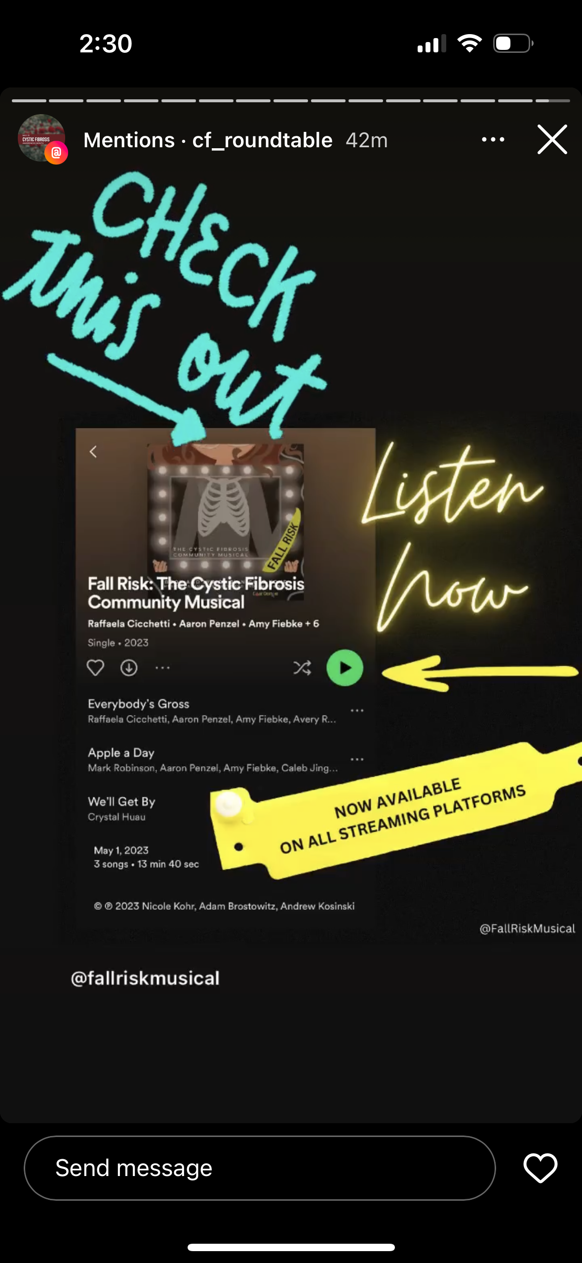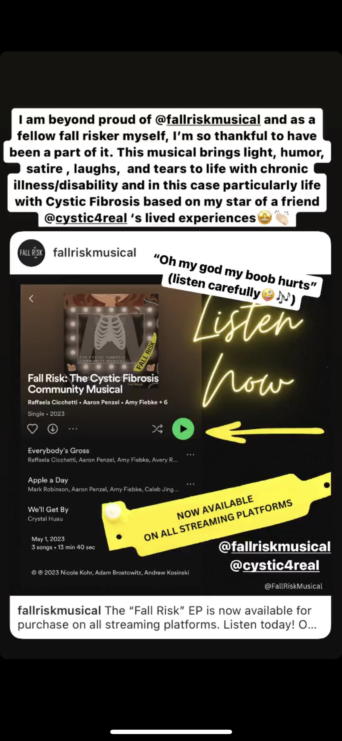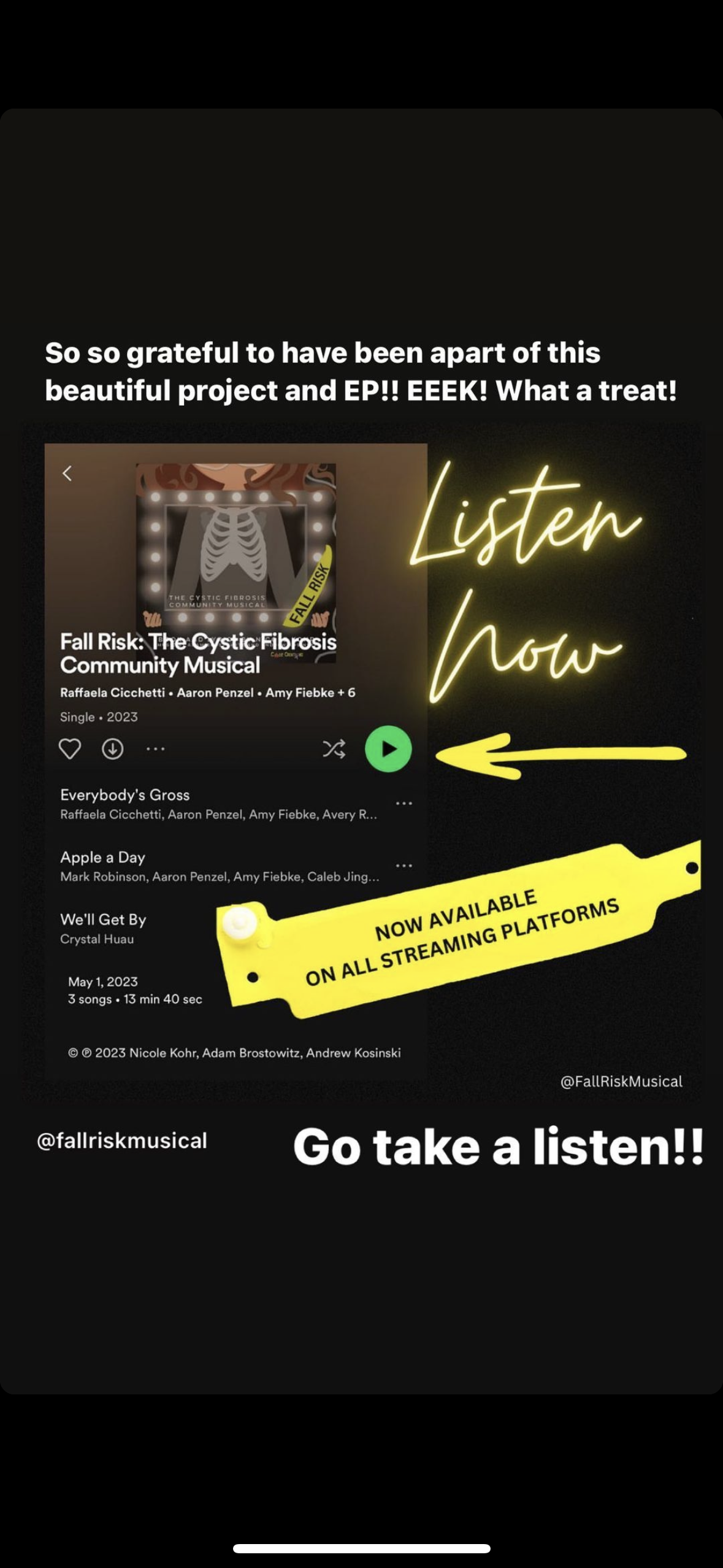 Thank you to every volunteer who took part in this making of this musical. They are responsible for the beautiful music that you will hear beginning on May 1, 2023. From the lyrics, to the music composition, to the instrumentation, to the vocals, to the direction, to the editing and mixing… this album was made by and for the cystic fibrosis community.