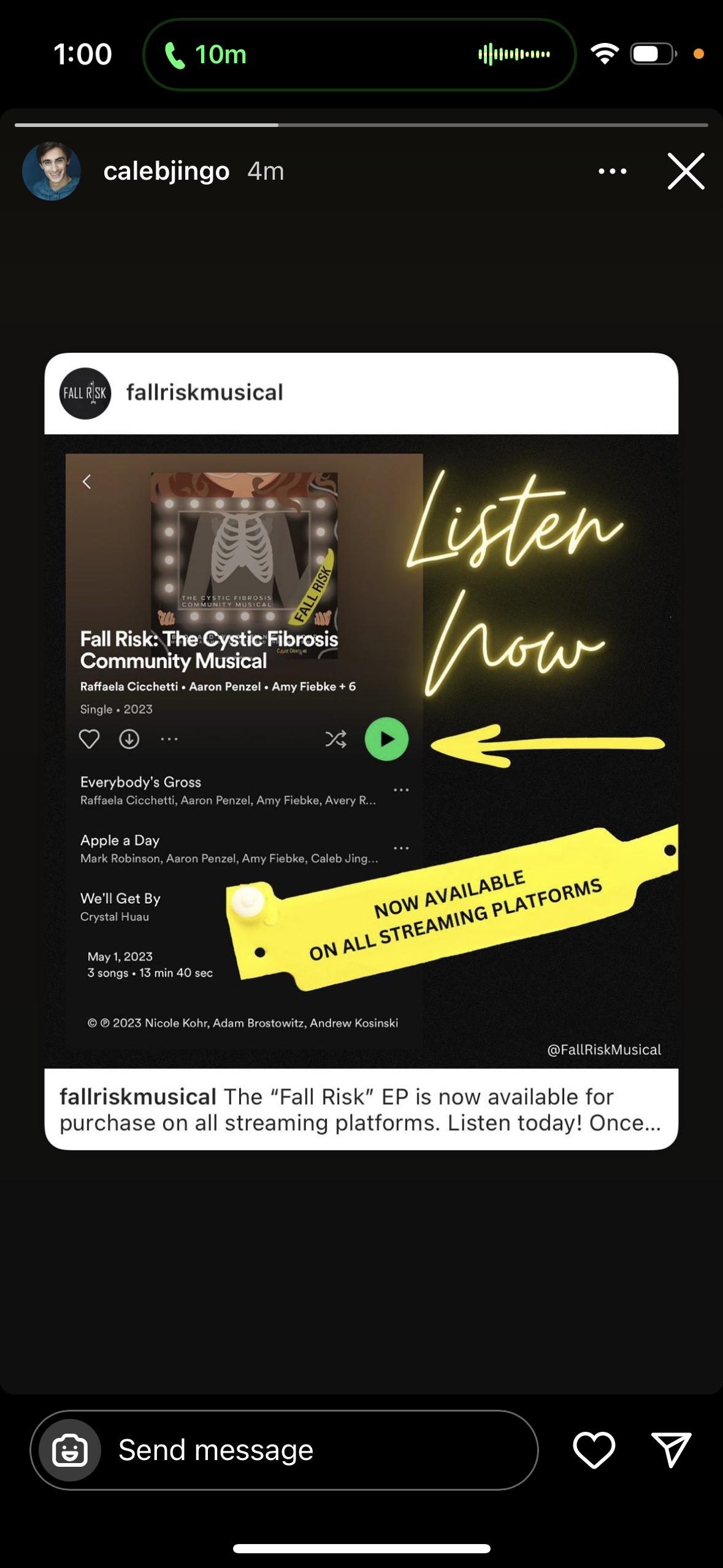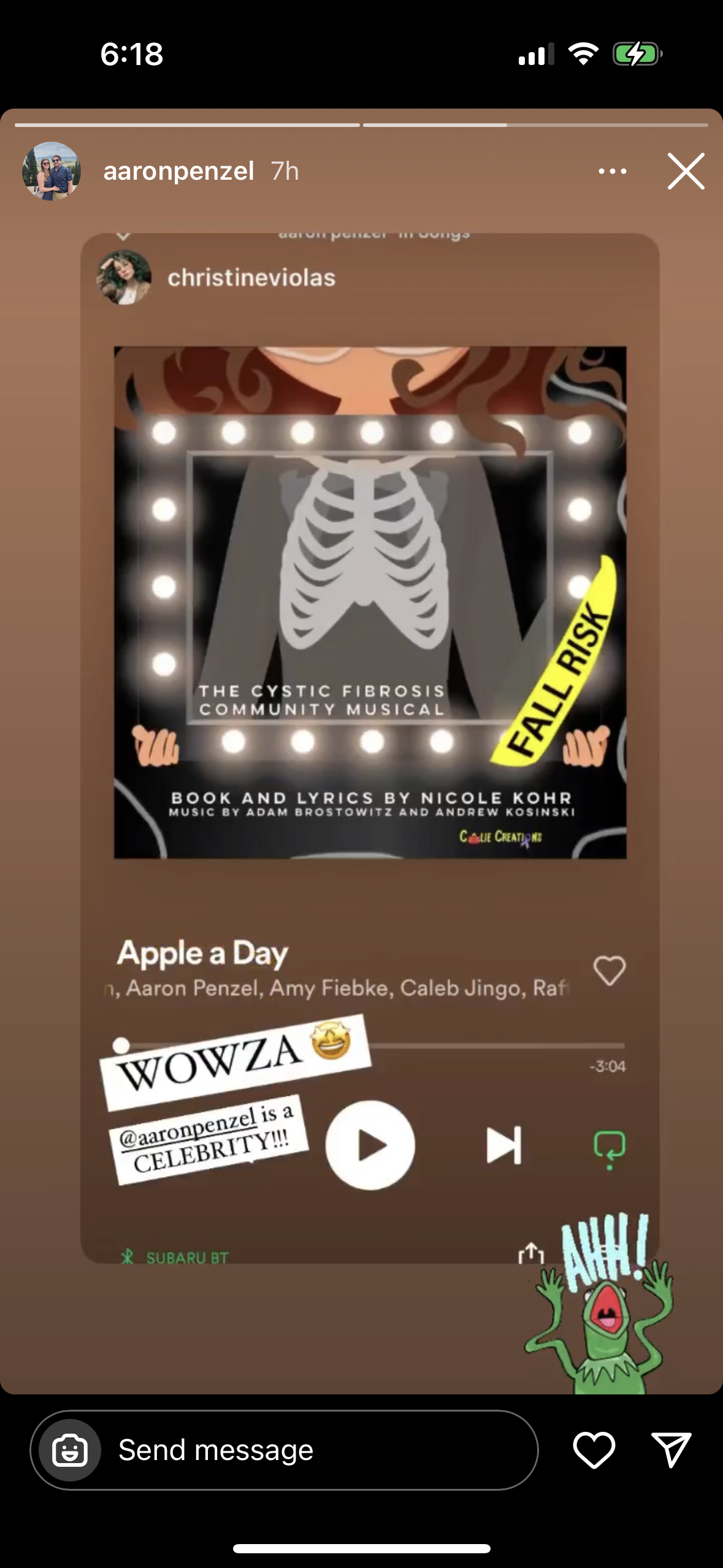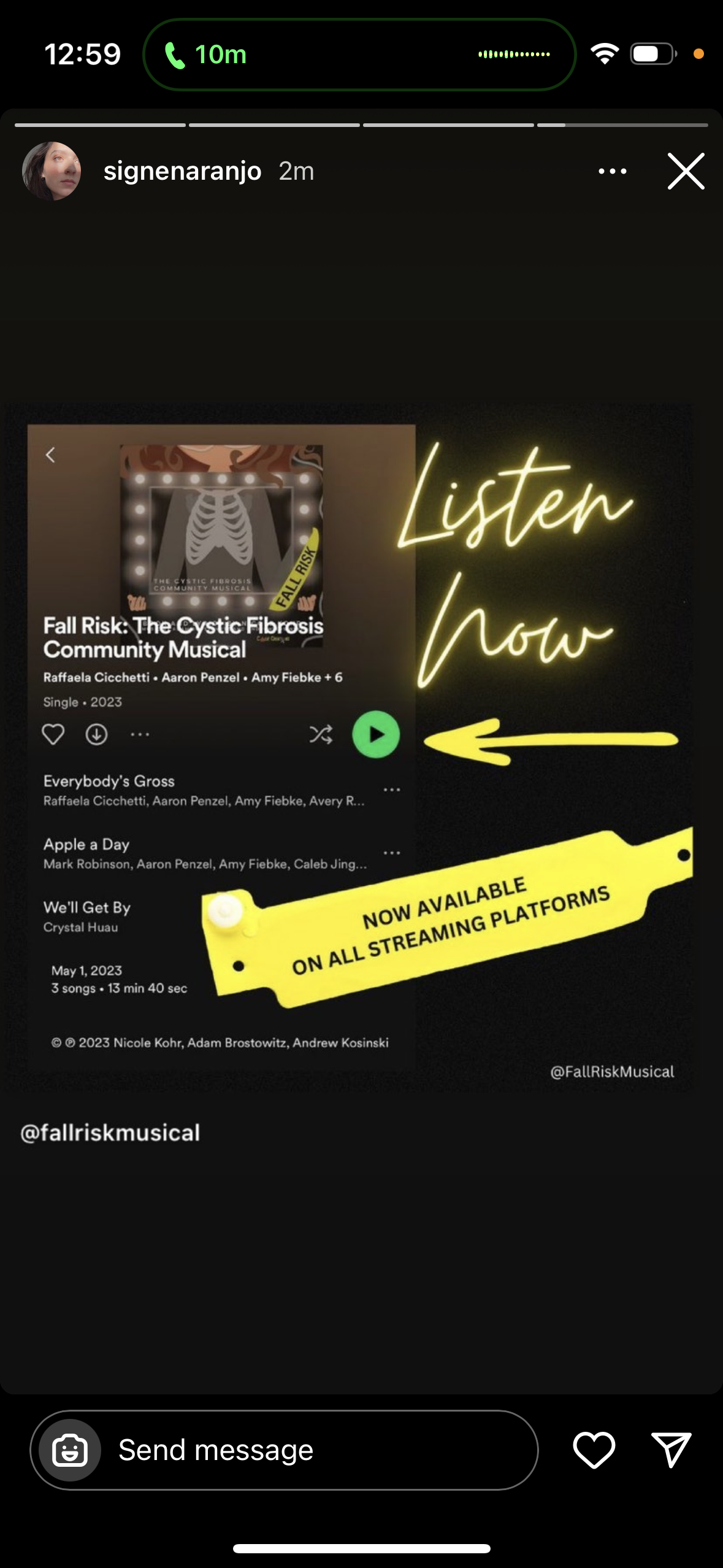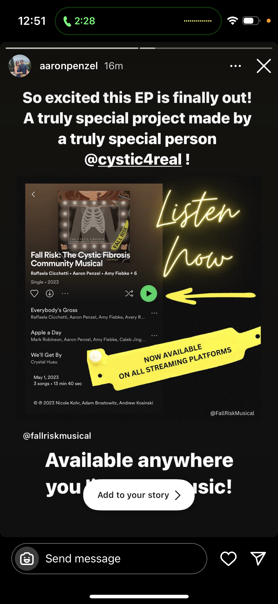 Thank you to every volunteer who took part in this making of this musical. They are responsible for the beautiful music that you will hear beginning on May 1, 2023. From the lyrics, to the music composition, to the instrumentation, to the vocals, to the direction, to the editing and mixing… this album was made by and for the cystic fibrosis community.