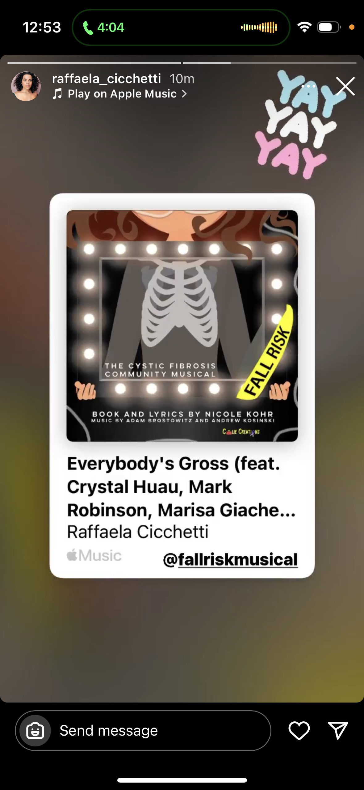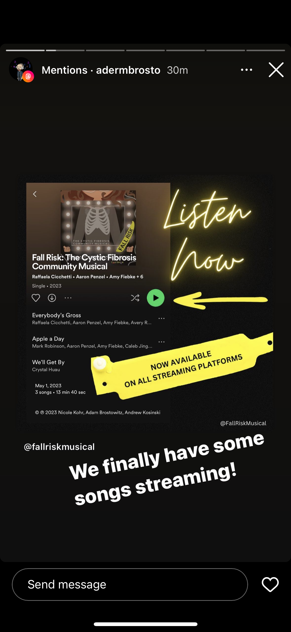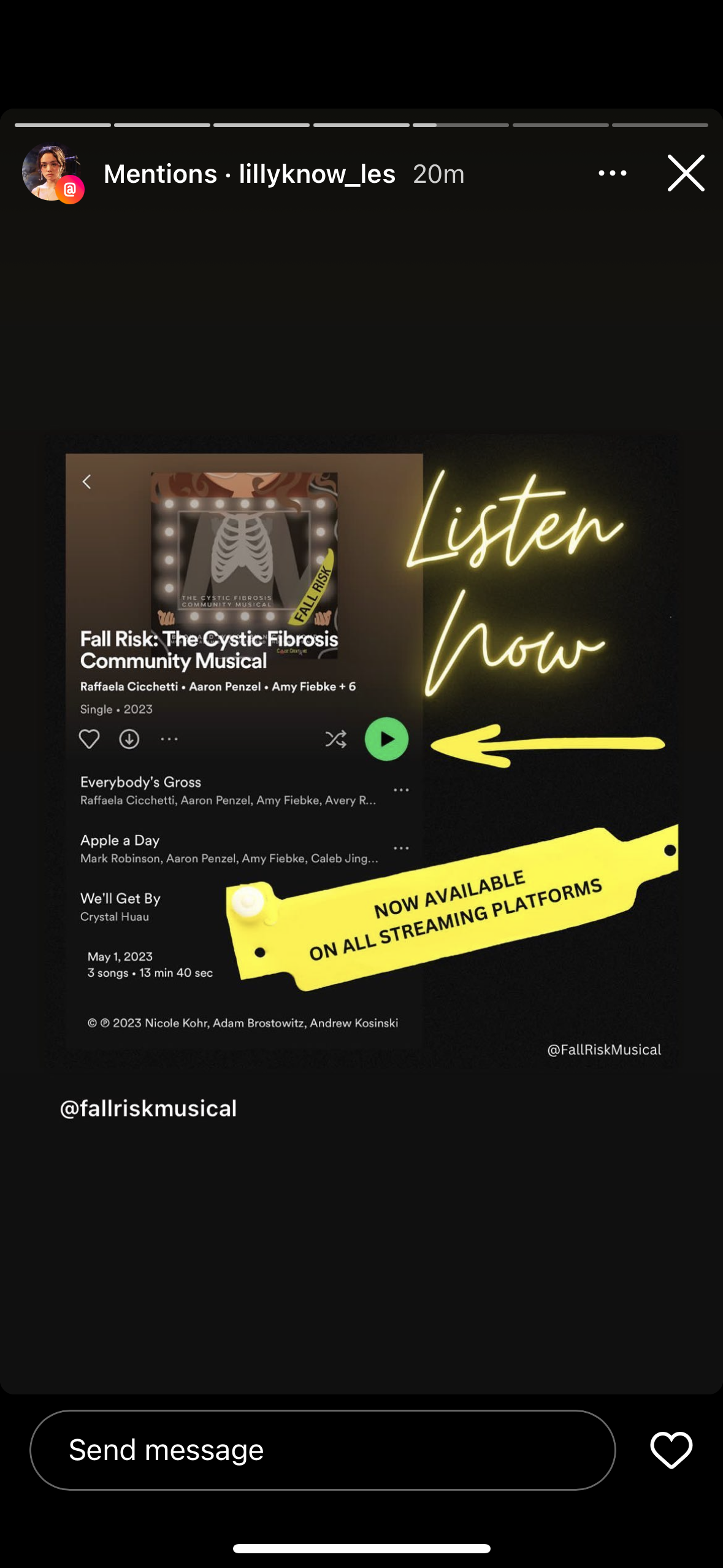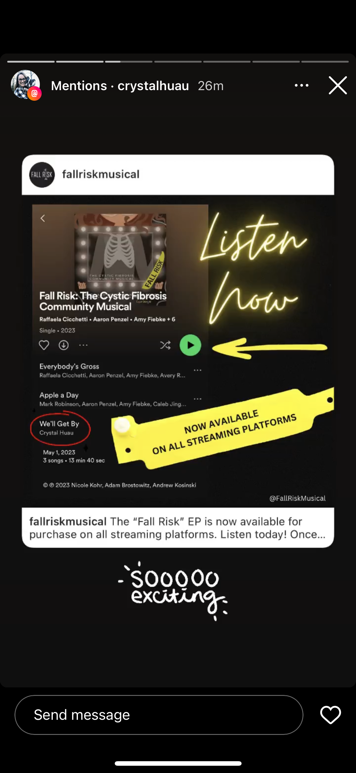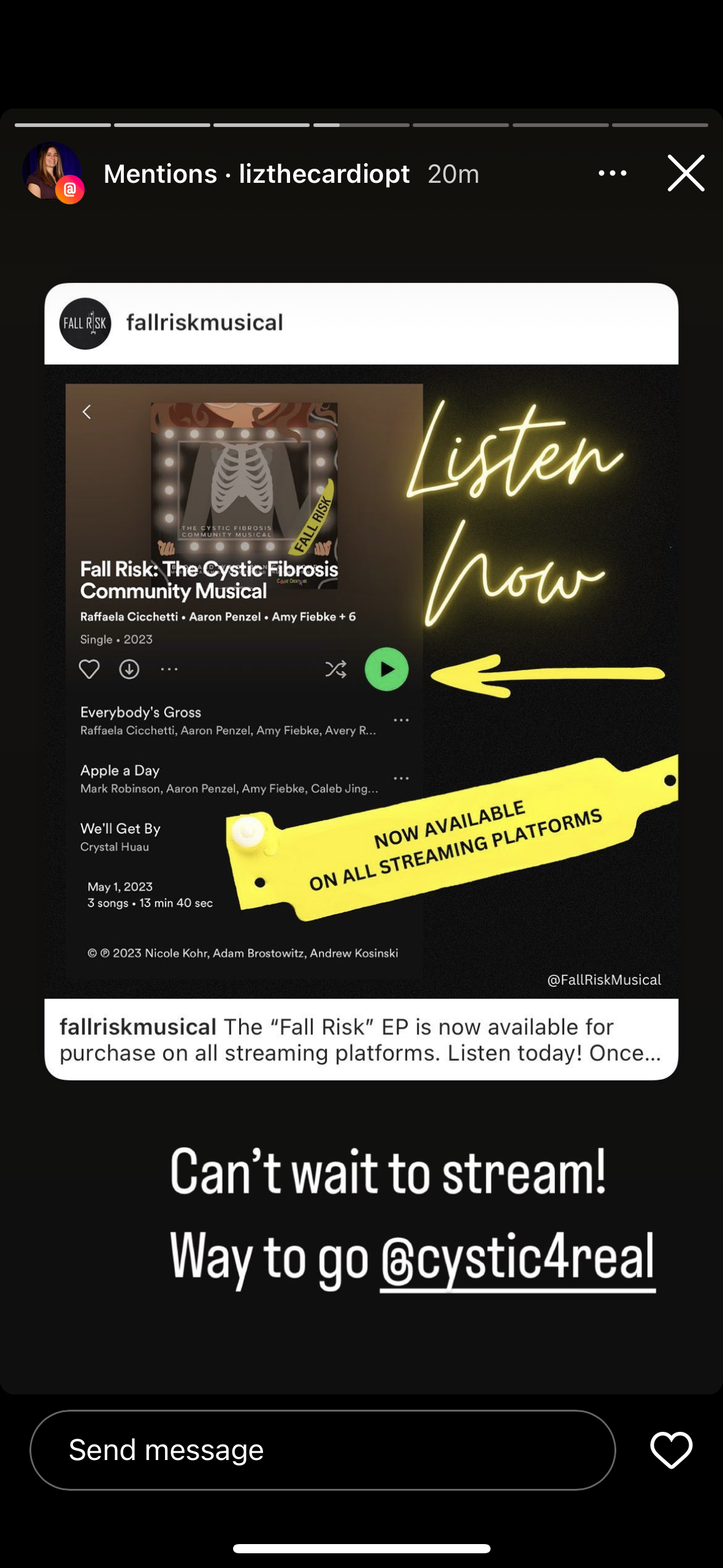 Thank you to every volunteer who took part in this making of this musical. They are responsible for the beautiful music that you will hear beginning on May 1, 2023. From the lyrics, to the music composition, to the instrumentation, to the vocals, to the direction, to the editing and mixing… this album was made by and for the cystic fibrosis community.